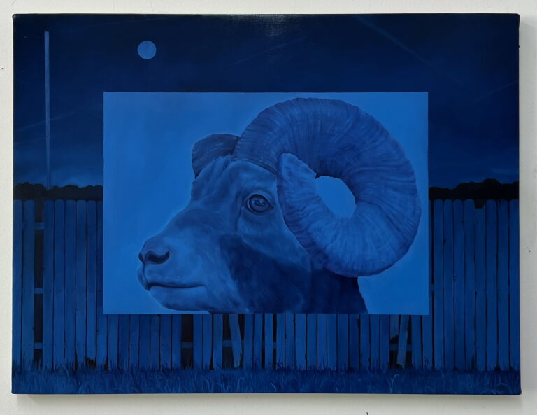 Claire HarnEnz constructs animal imagery—particularly horses and rams—using a restrained, monochromatic palette. Her subjects inhabit sparse, architectonic spaces, where unexpected combinations of natural and manmade elements suggest a quietly poetic logic.