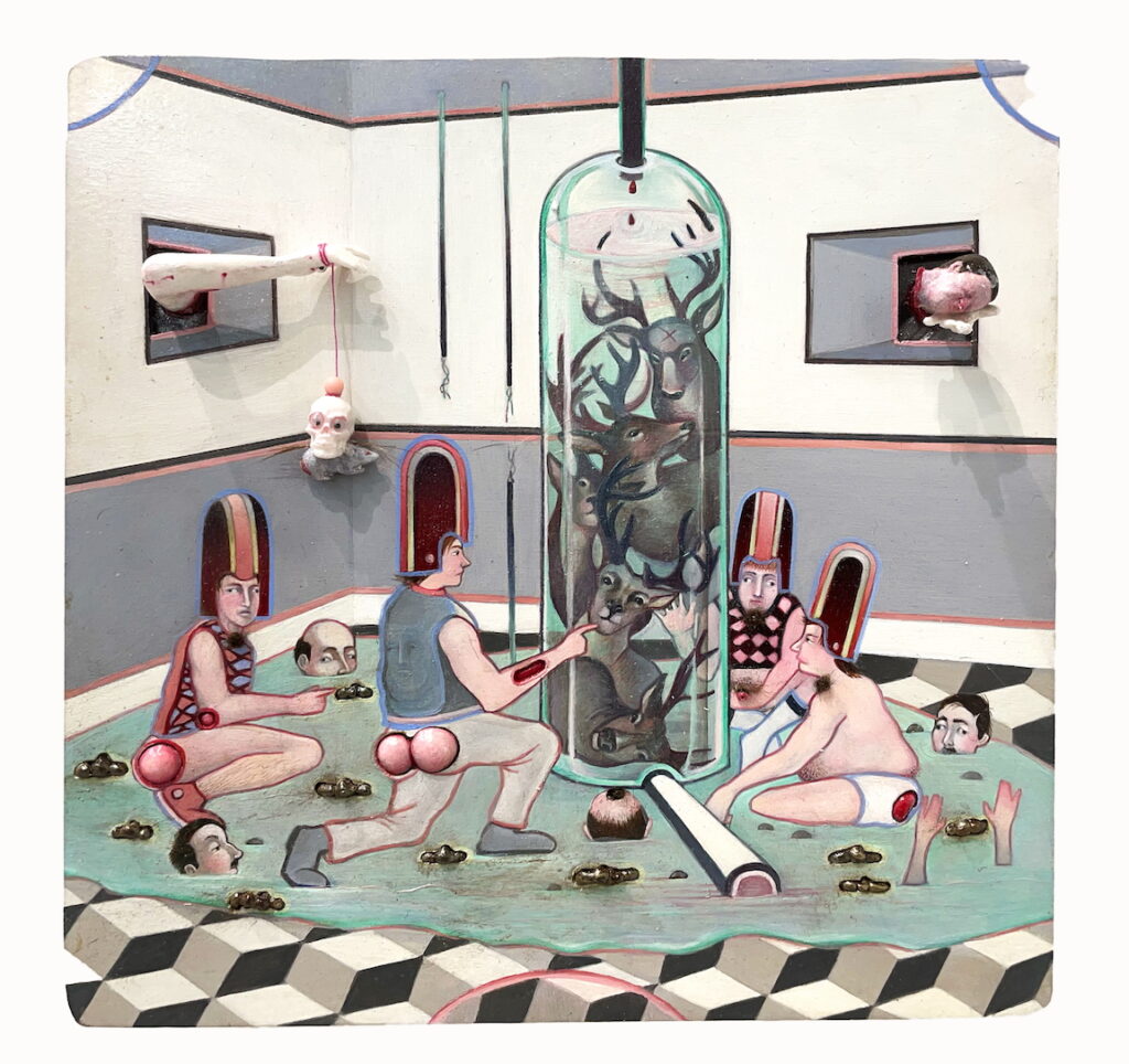 Bunker Room 3- Game Rooms, water soluble oil, polymer clay, moldable plastic silicone on wood,